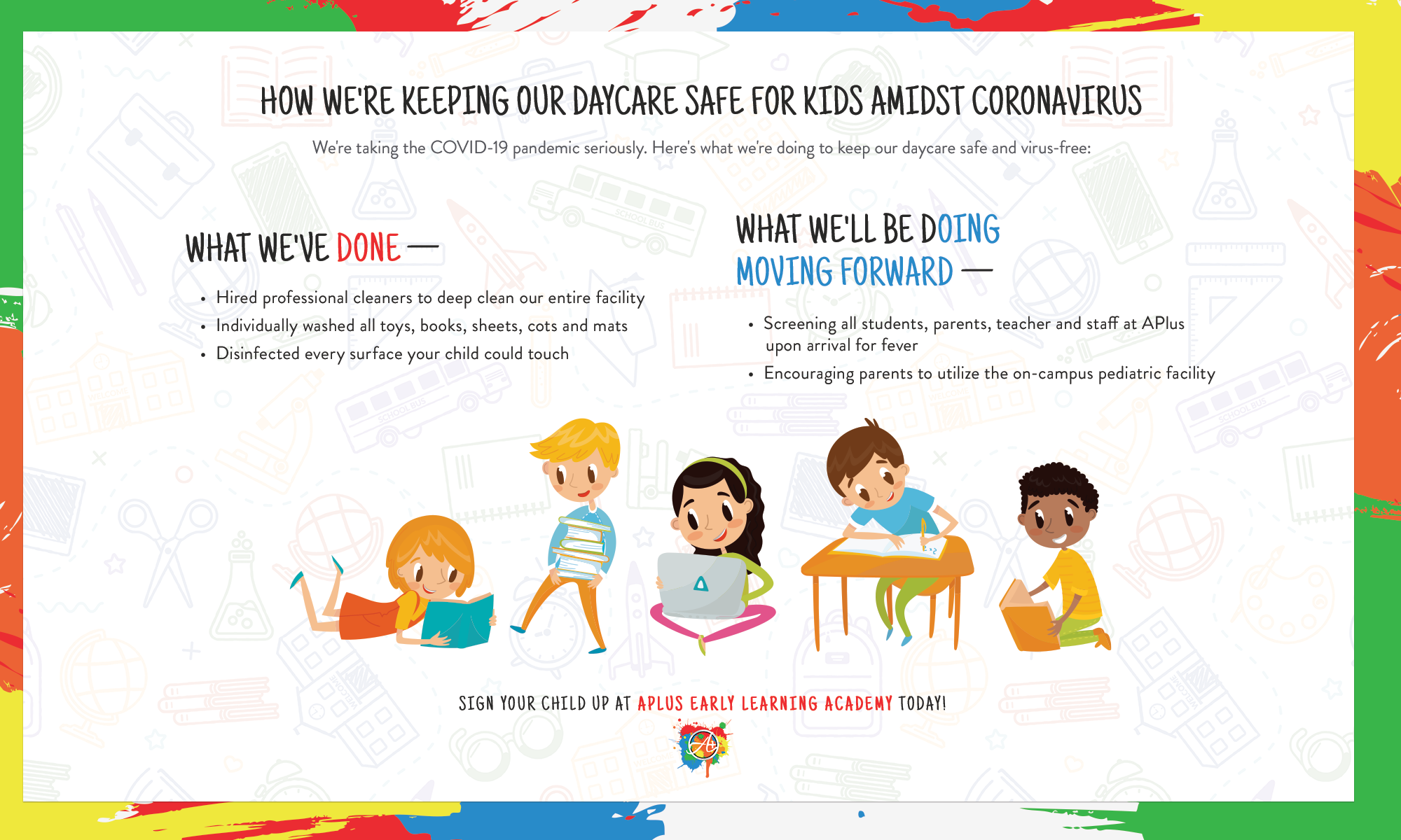 We have now reopened APlus Early learning Academy and are ready to serve our hard-working parents, as well as any hospitals, medical staff, first responders, or simply new parents looking for a safe and clean enriching school for their little ones! Feel confident knowing your child’s learning and development is engaging and uninterrupted by the coronavirus outbreak. We believe in the importance of child development, and we’ve worked hard to ensure your child receives the same fun education, exciting play, and healthy meals they always do at our Marietta daycare, no matter what happens.